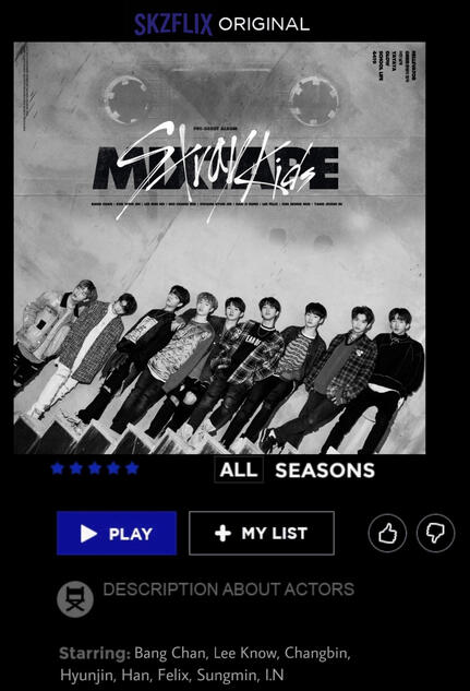 Hi, Stay! ¡Welcome to SKZFLIX! This is a website made for stay by stay.We had the idea of making SKZFLIX because of the video they uploaded on stay's 2nd anniversary in 2020, where in the beginning you can see the SKZFLIX logo. We thought it would be cool if something like it was real!In this website we share links to the official videos and when the show has not been uploaded officially, we try to search it with English subtitles. If you know where to watch a program/show with subtitles in another language, you can send them to us and we'll check it.We recommend using SKZFLIX on your computer or your phone in "desktop site" mode.If there's something that's not working, please tell us!We'll keep updating SKZFLIX and we'll notify it on our Twitter: @realSKZFLIX